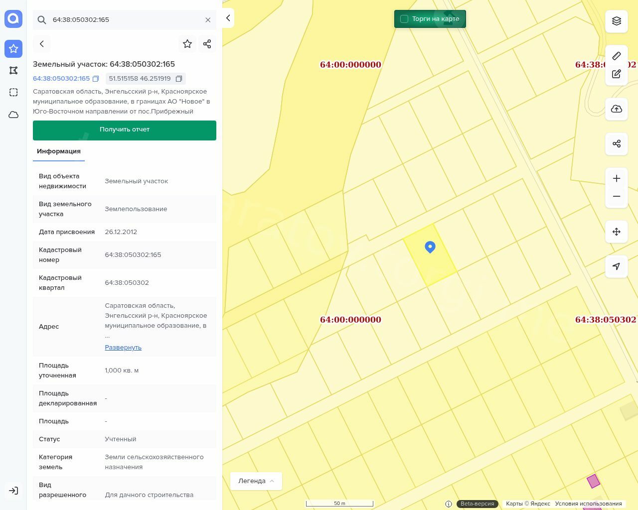 Земельный участок, кадастровый номер: 64:38:050302:165; площадь 1000 кв. м.; категория земель земля сельскохозяйственного назначения; вид разрешенного использования: для дачного строительства