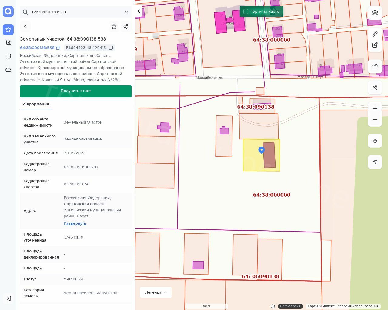 Земельный участок, из категории земель населенных пунктов, вид разрешенного использования: земельные участки (территории) общего пользования, площадью 1745,0 кв. метров. Кадастровый номер 64:38:090138:538, расположенный по адресу: Саратовская область, Энгельсский район, с. Красный Яр, ул. Молодежная, 26б;