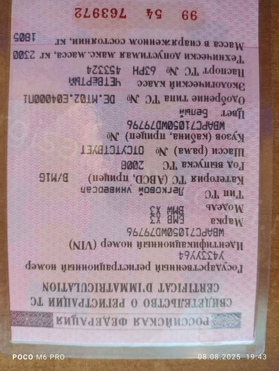 BMW модель X3; - Идентификационный номер (VIN): WBAPC71050WD79796; - Тип ТС: легковой универсал; - Год выпуска: 2008;