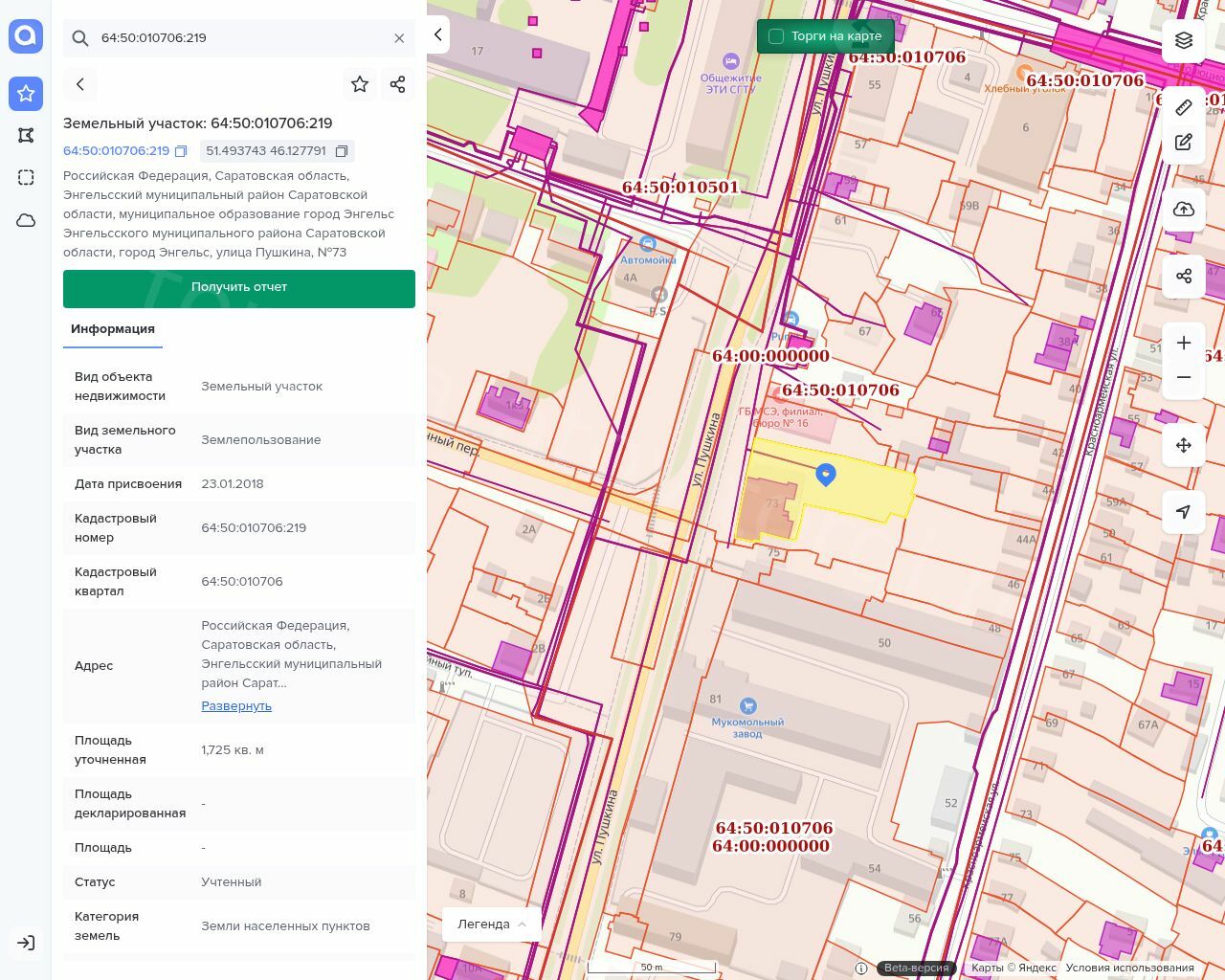 Нежилое здание, являющееся объектом культурного наследия местного (муниципального) значения «Дом И. М. Енца, в котором происходили заседания первой организации С.Д.Р.П. /б/», площадью 339,6 кв.м, с кадастровым номером 64:50:000000:3074, расположенное по адресу: Российская Федерация, Саратовская область, м.р-н Энгельсский, г.п. город Энгельс, г. Энгельс, ул. Пушкина, д. 73 с земельным участком площадью 1725,0 кв.м, с кадастровым номером 64:50:010706:219